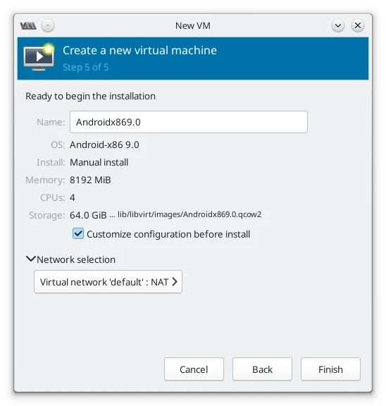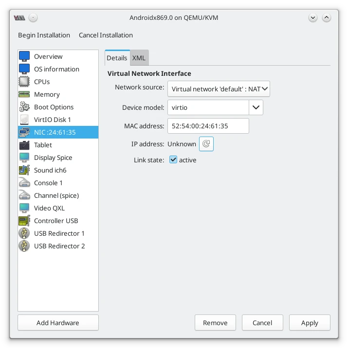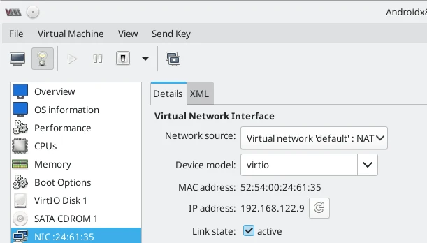 Check IP address of Android-x86 VM from Virt Manager → NIC