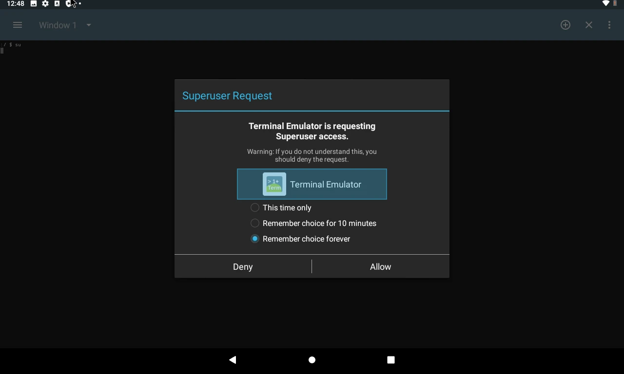 Terminal Emualtorin Android-x86 VM. Typesu, grant root permission: