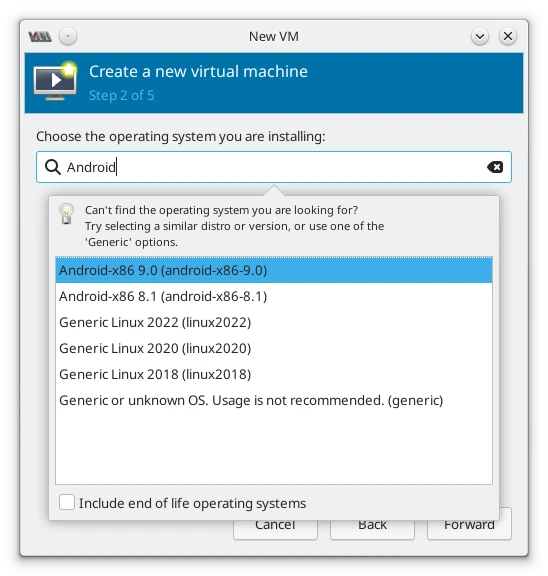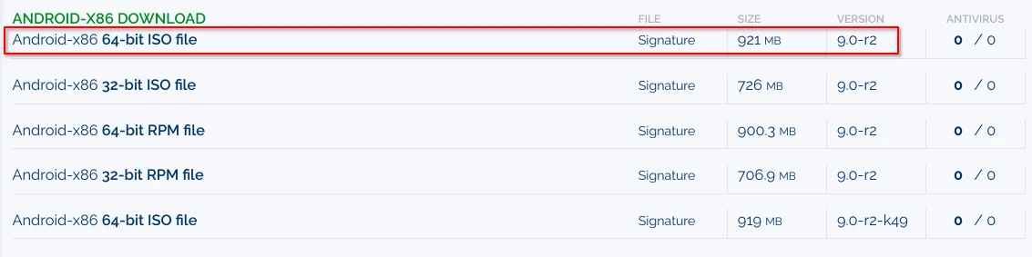Download Android-x86 ISO from official website. Choose Android 9.0-r2 64bit.