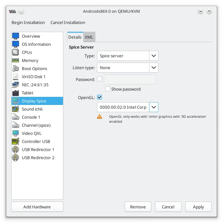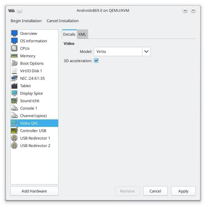 Video QXL, switch toVirtio. Check3D acceleration. Apply.