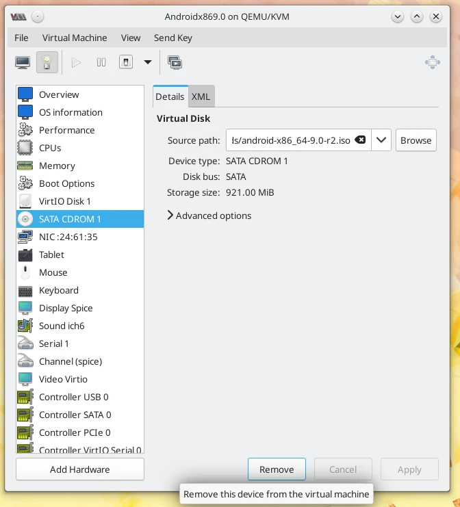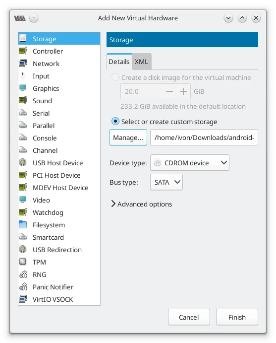 Add Hardware, clickStorage, switchDevice TypetoCDROM. SwitchBus TypetoSATA. ClickManageand select Android-x86 ISO. Finish.