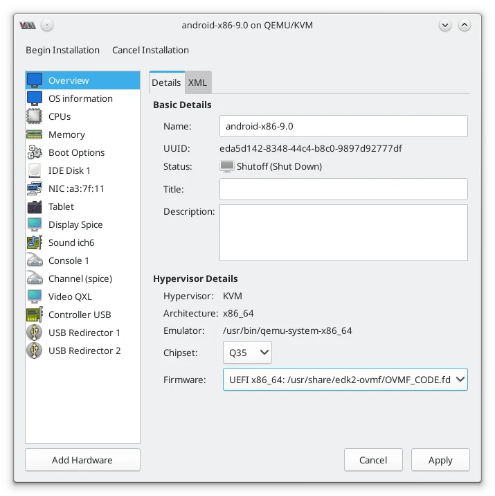 Overview. SelectQ35forChipsetandUEFI x64 OVMF_CODEforFirmware. Apply.
