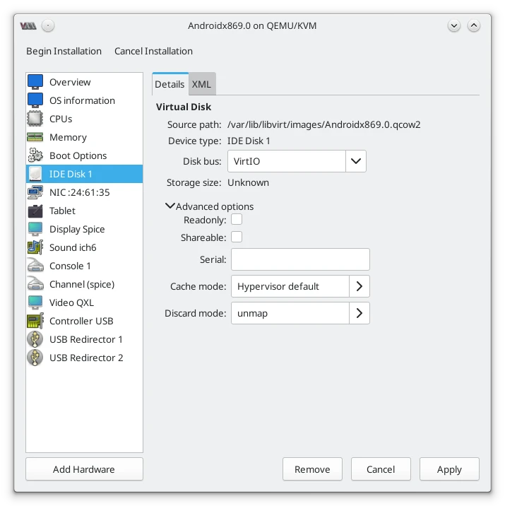 IDE Disk, switch Disk bus toVirtIO. Apply.