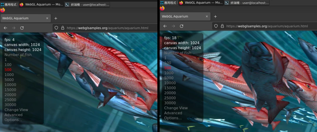The FPS of WebGL Aquarium doubled after enabling virgl. (You need to force enable WebGL in about:config)