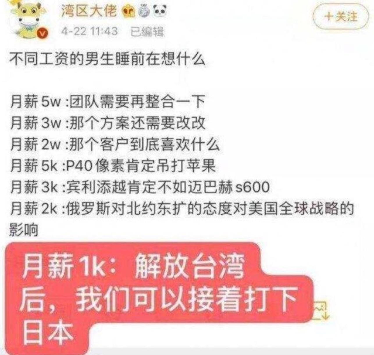 殊不知這常常是顱內高潮。畢竟正常人士,或者說businessman不會整天想著民族大計有的沒的意識形態,而是想著做好工作,為未來著想。不排除有些比較聰明的大粉紅,懂得利用大義的名分來包裝自己,賺窮小粉紅的錢。