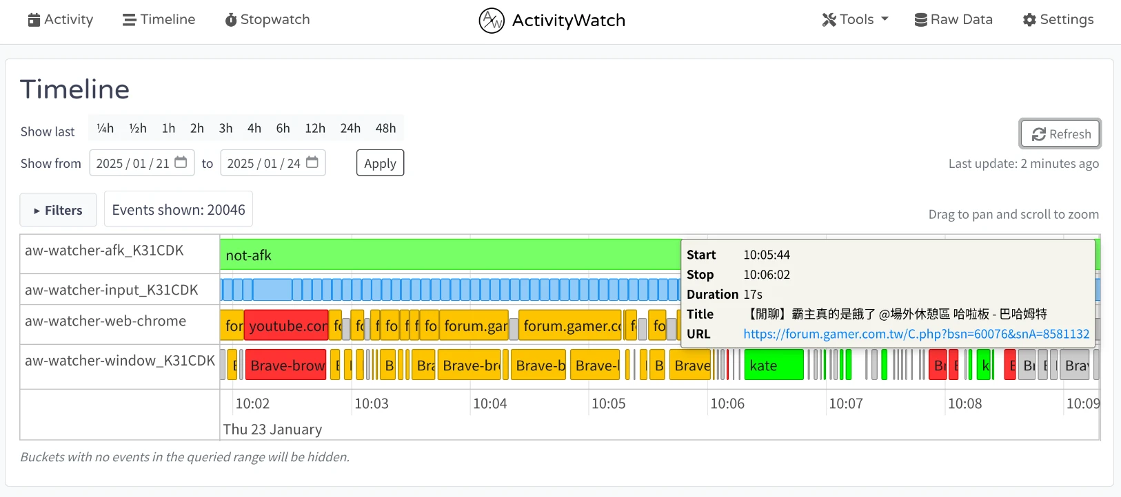 Timeline,透過時間軸檢視一段時間內,程式的使用時長。ActivityWatch會將目前活動中的視窗判定為你正在使用這個程式,切換到其他程式後便跟著切換,所以才會出現一截一截的樣子。