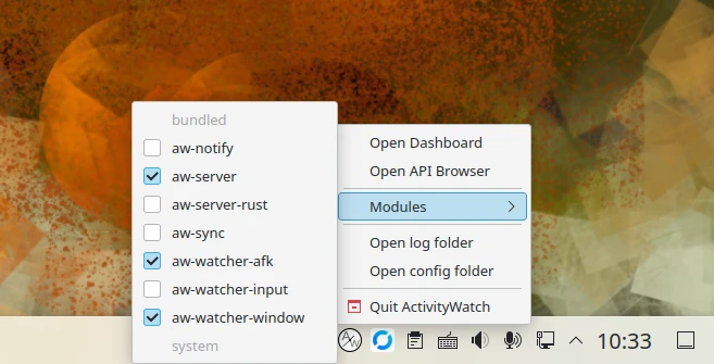 - 點選系統匣的ActivityWatch圖示,開啟全部監控模組。