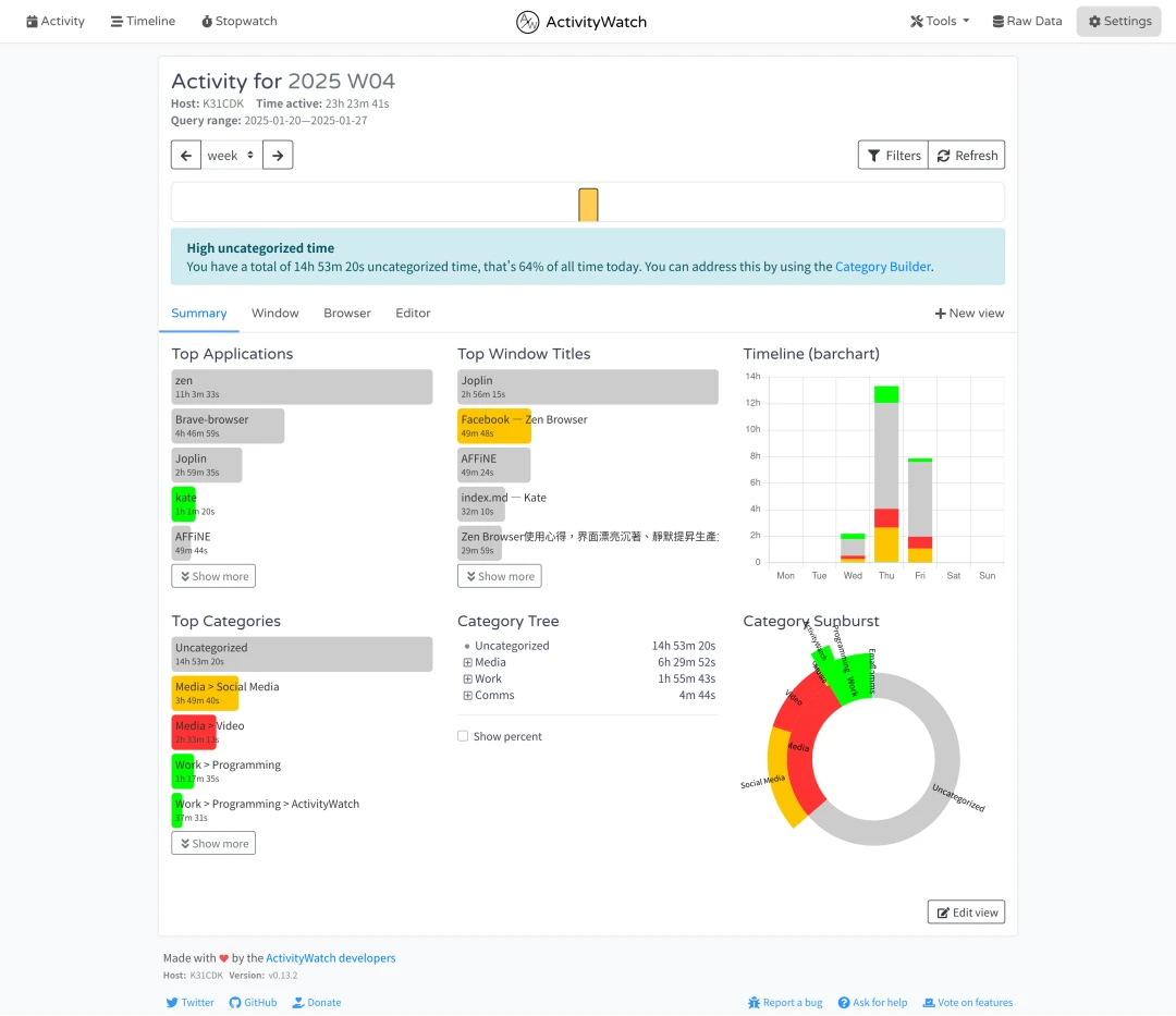 Linux用戶需要注意,因為Wayland不允許其他程式偵測視窗標題,官方版ActivityWatch不支援Wayland工作階段,只支援X11。Wayland工作階段要裝這個:2e3s/awatcher,並將其作為ActivtyWatch的模組載入。