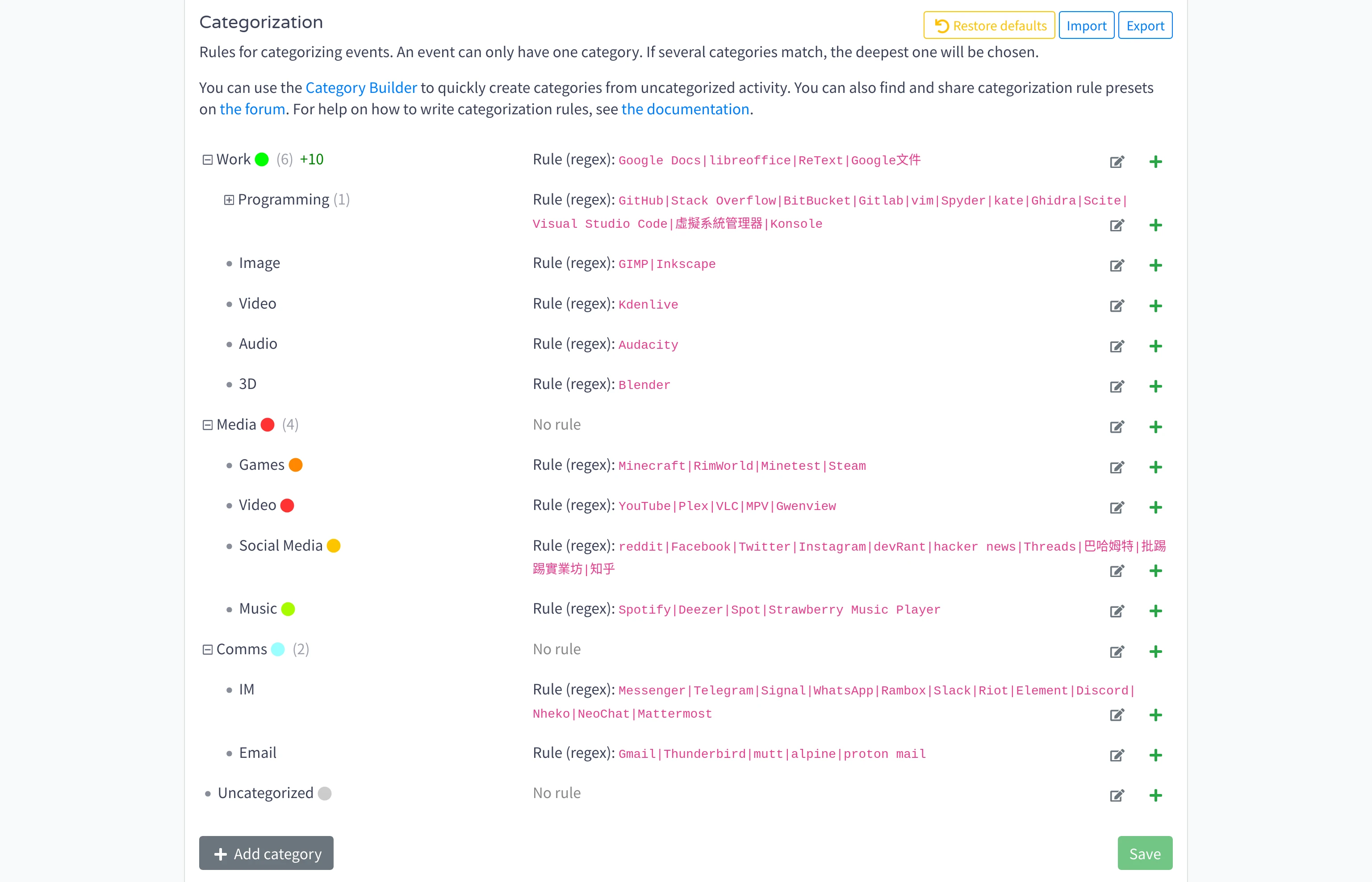 接著要設定應用程式分類。ActivityWatch是用正則表達式檢測應用程式的名稱的,沒辦法收錄所有程式。如果你不手動加入常用程式,那麼後續的資料裡面會顯示統一為"uncategorized"。這裡Category能夠自訂規則,把你認為是Work的應用程式分類到這裡吧!須注意ActivityWatch是依照視窗標題下去偵測,而非應用程式名稱。