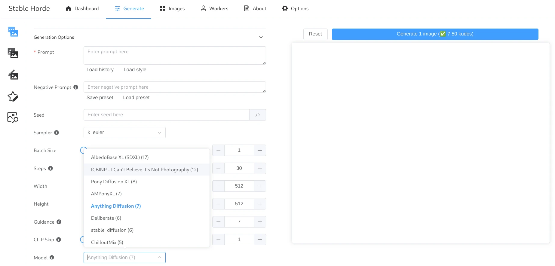 Stable UI提供文生圖、圖生圖、局部重繪服務。如果操作Stable Diffusion WebUI應對這些參數熟悉才是。AI Horde除了原始的Stable Diffusion模型外,尚提供「Anything」這類熱門的生圖模型。
