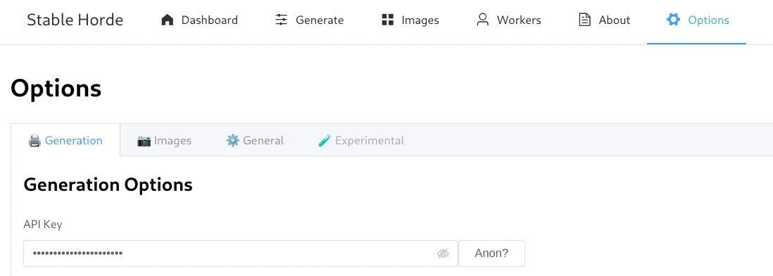 儘管AI Horde使用不需要帳號,但伺服器會優先處理有註冊帳號用戶的生圖請求,匿名用戶優先度較低。因此請先到AI Horde網站註冊帳號,取得API Key