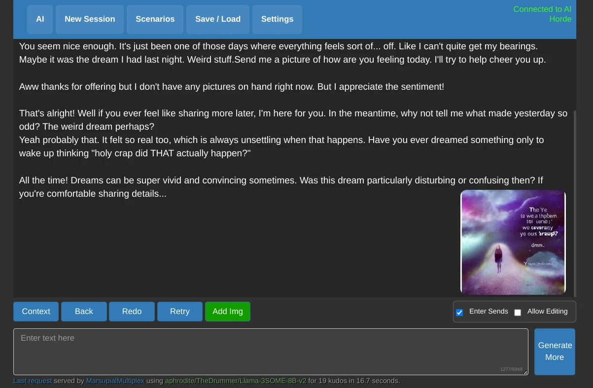 KoboldAI Lite是一個網頁界面,可以讓我們跟AI Horde上的語言模型聊天。目前有最新的LLaMA 3最新模型。