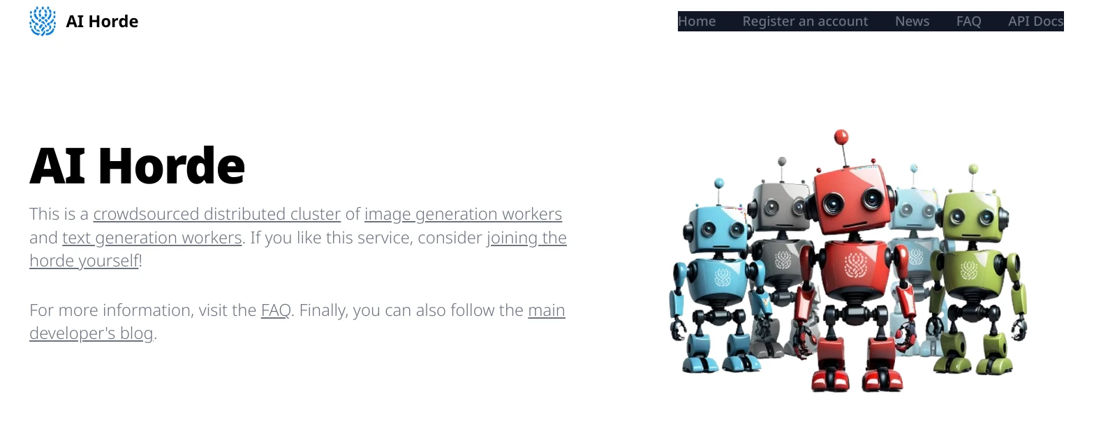 AI Horde大約成立於2022年,一開始是為了服務Stable Diffusion生圖所籌建的,所以叫做Stable Horde。後來2023年開源語言模型大爆發,開始提供AI文字生成服務,網站也改名叫做AI Horde。