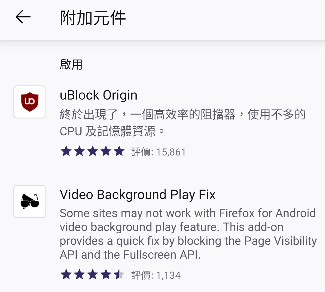 在附加元件列表搜尋「uBlock Origin」和「Video Background Play Fix」,這樣網頁版Youtube(https://m.youtube.com)就可以達到去廣告和背景播放的效果。