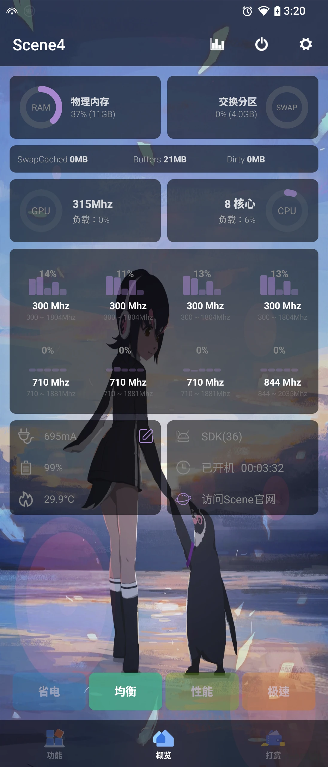 安裝Scene,開啟均衡模式。不需要刷SD888 Efficient Tuning,讓它自己在背景調控頻率就行了