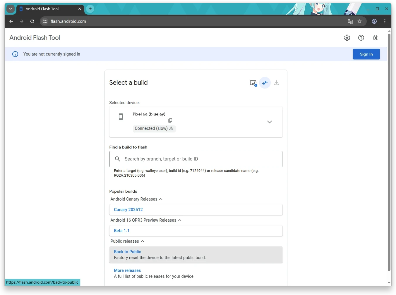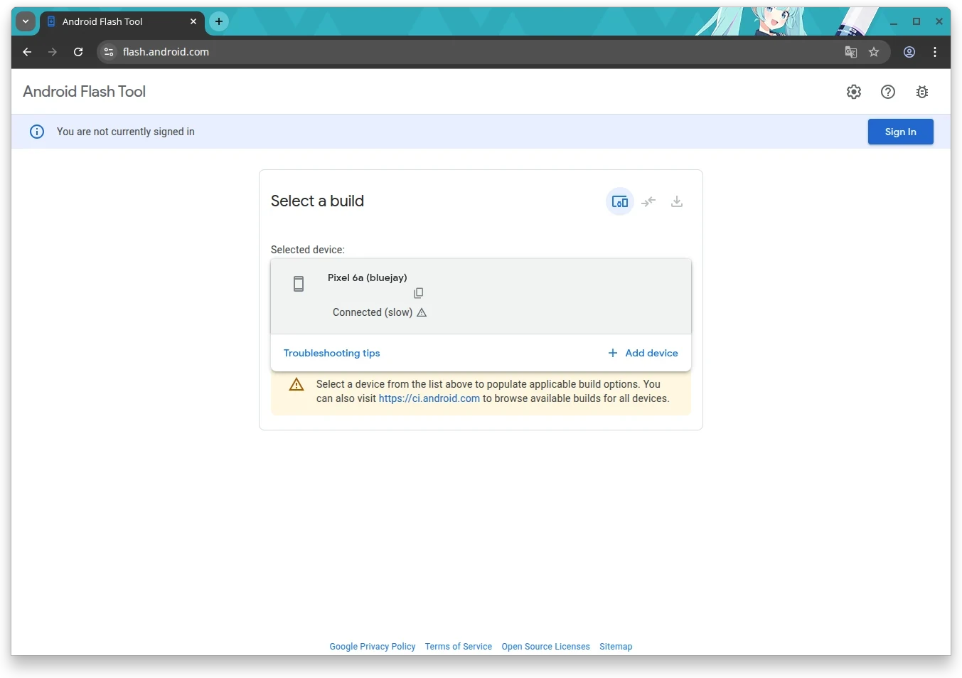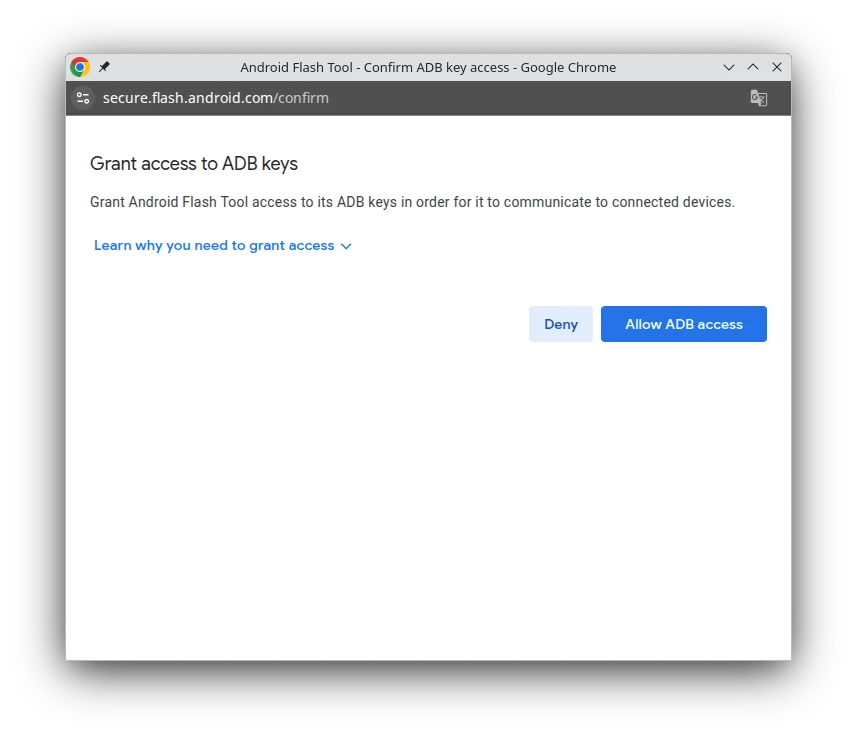 用Chrome瀏覽器開啟這個網頁:https://flash.android.com。一定要基於Chromium開發的瀏覽器才支援WebUSB,Firefox不行。