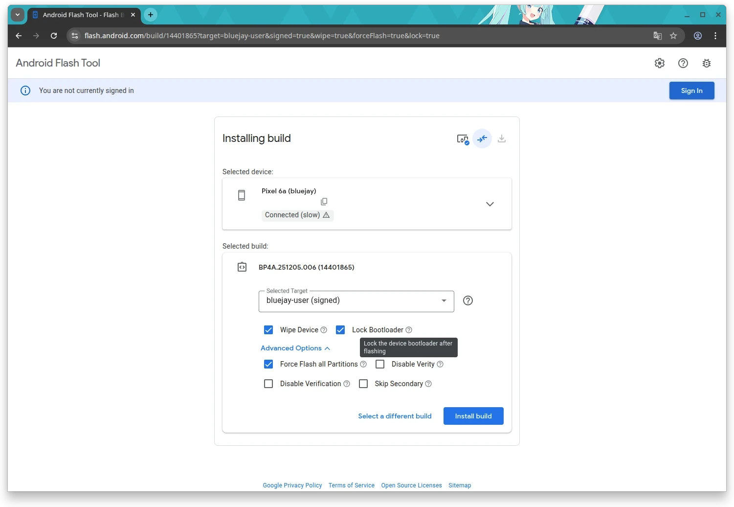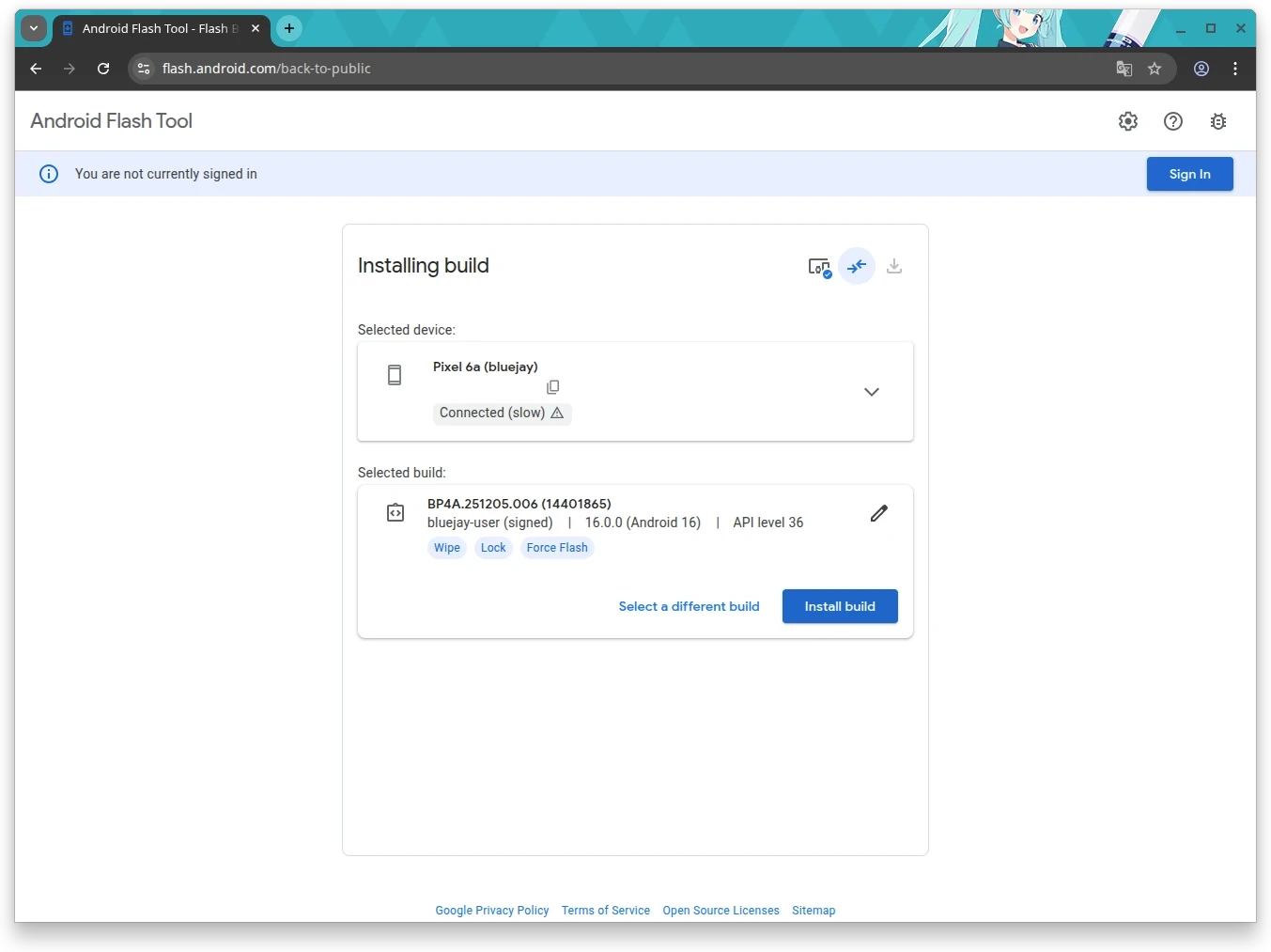 按下Install Build,等待系統映像檔下載完成,接著就會進行刷入。等到畫面顯示完成前都不要斷開手機。