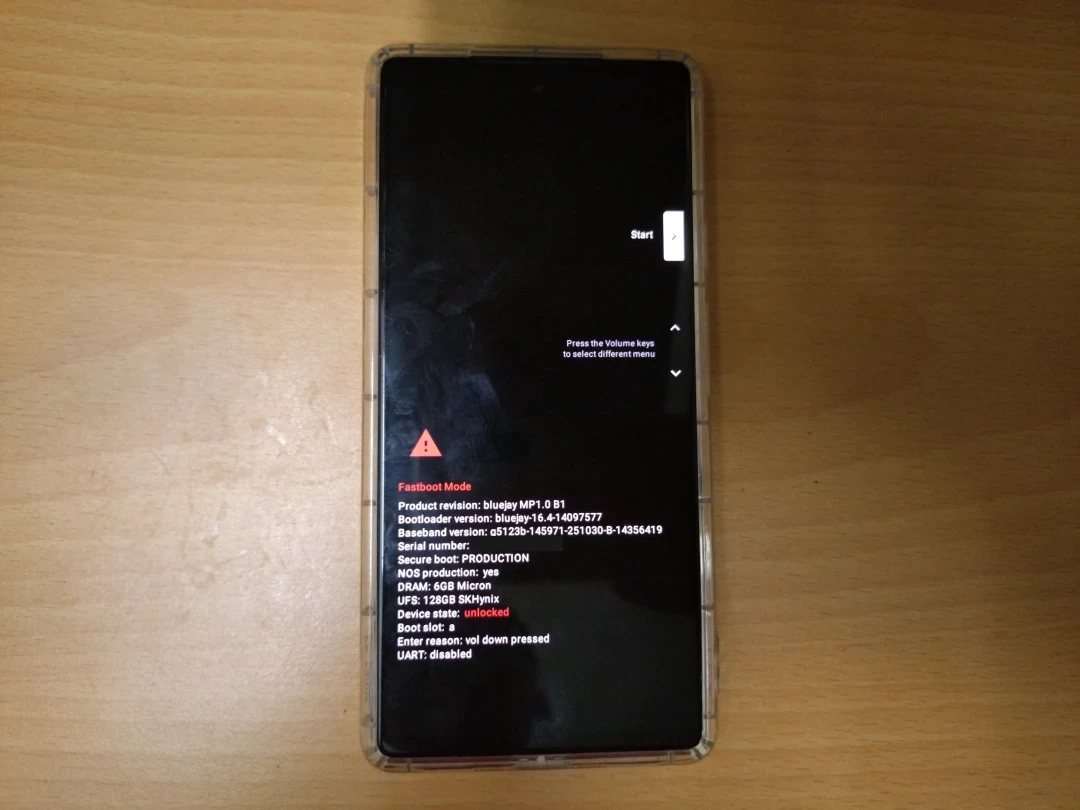 讓Pixel手機進入Fastboot模式,例如Pixel 6a就是關機後,長按電源鍵+音量下鍵,開機顯示紅字進入Fastboot