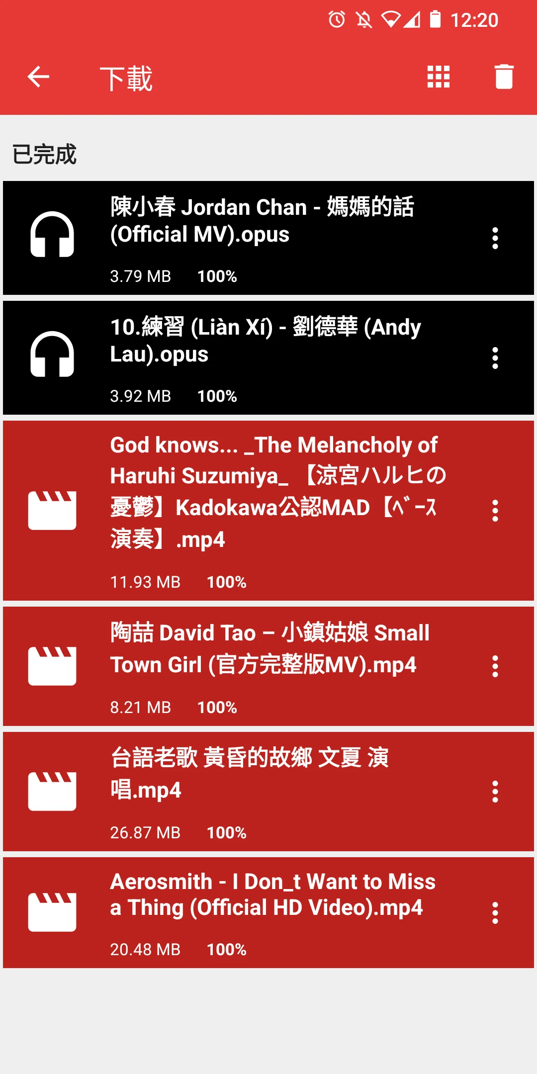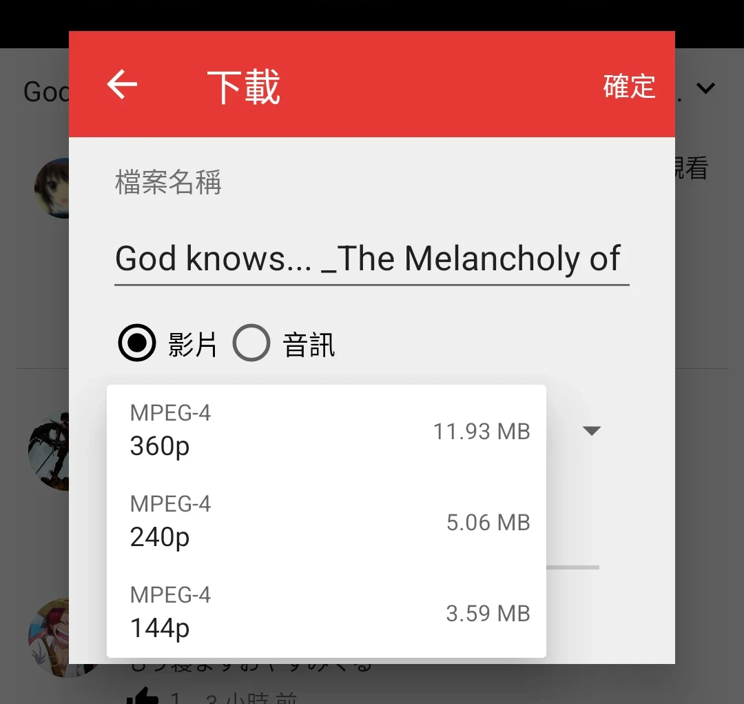 在影片播放界面,或是搜尋結果頁面對影片縮圖長按,可選擇下載影片或是音訊。