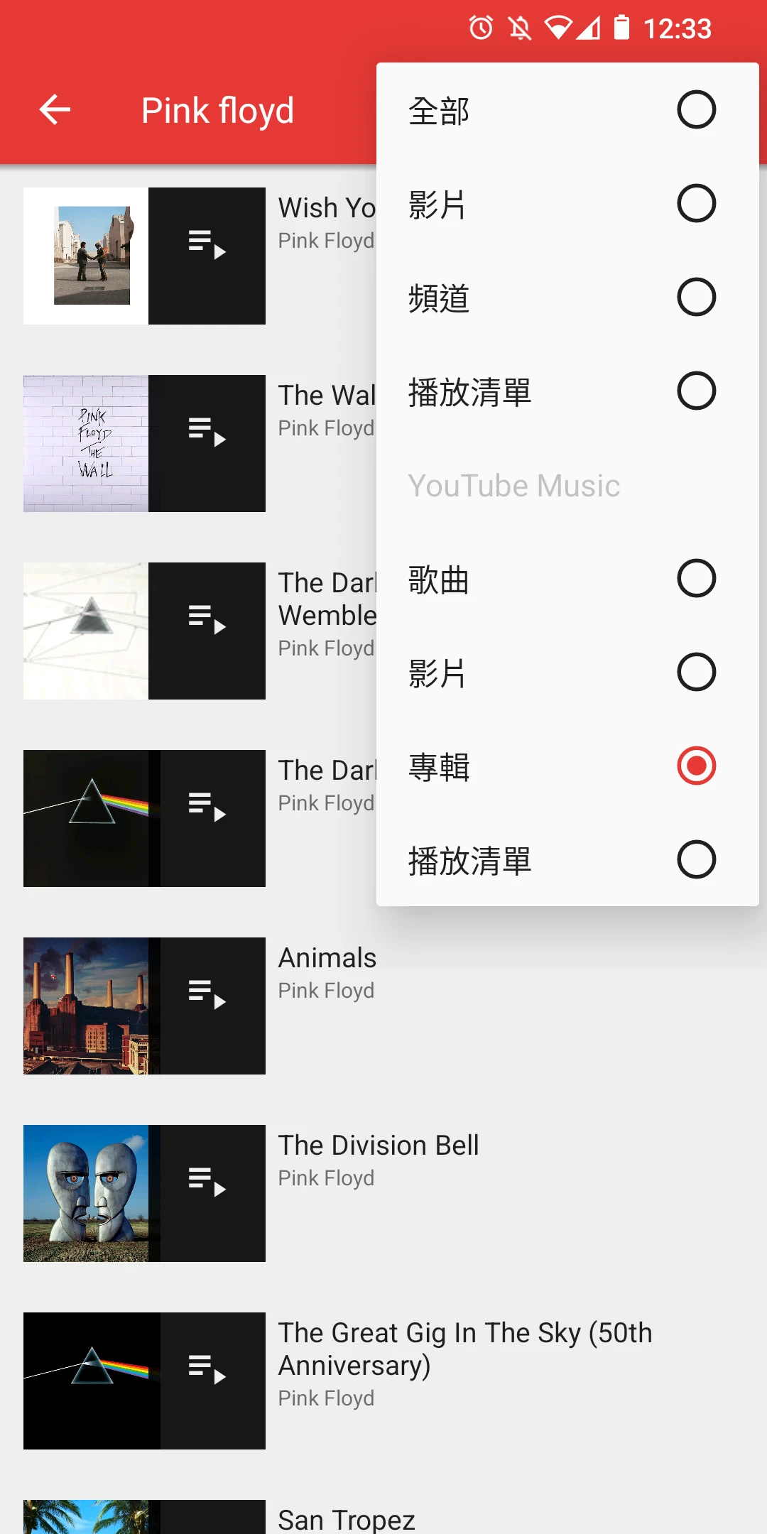 NewPipe有一個好用的功能:在搜尋音樂時只搜尋Youtube Music的結果,這樣就只會顯示音樂專輯,而不會混入MV。