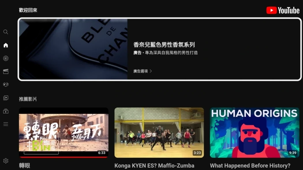 比較:這是原版電視Youtube的首頁