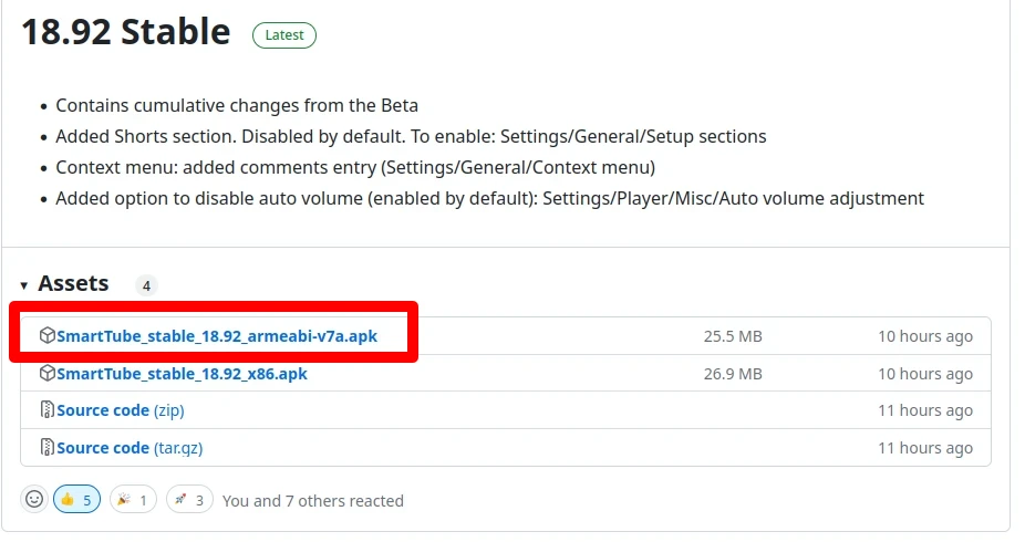 因此,請到Github Release下載SmartTube的APK,找到寫有Stable版的區塊。SmartTube系統最低要求為Android 4.3。如果你的電視盒是64位元的就下載arm64-v8a,32位元則是下載armeabi-v7a。