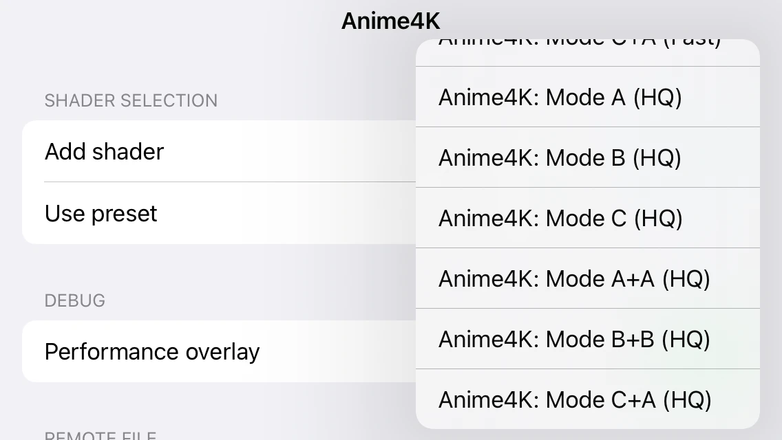 Preset有A、B、C、A+A、B+B、C+A五種模式,跟原版Anime4K一樣。每種模式由多個著色器組成,詳細內容參看開發者Github。建議先試試A+A (Fast),再按照你裝置的性能試試A+A (HQ)