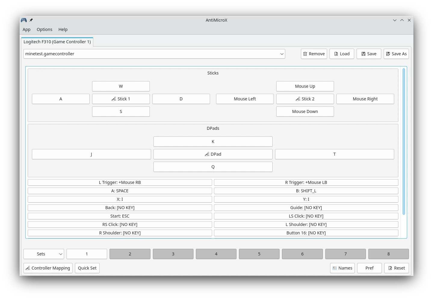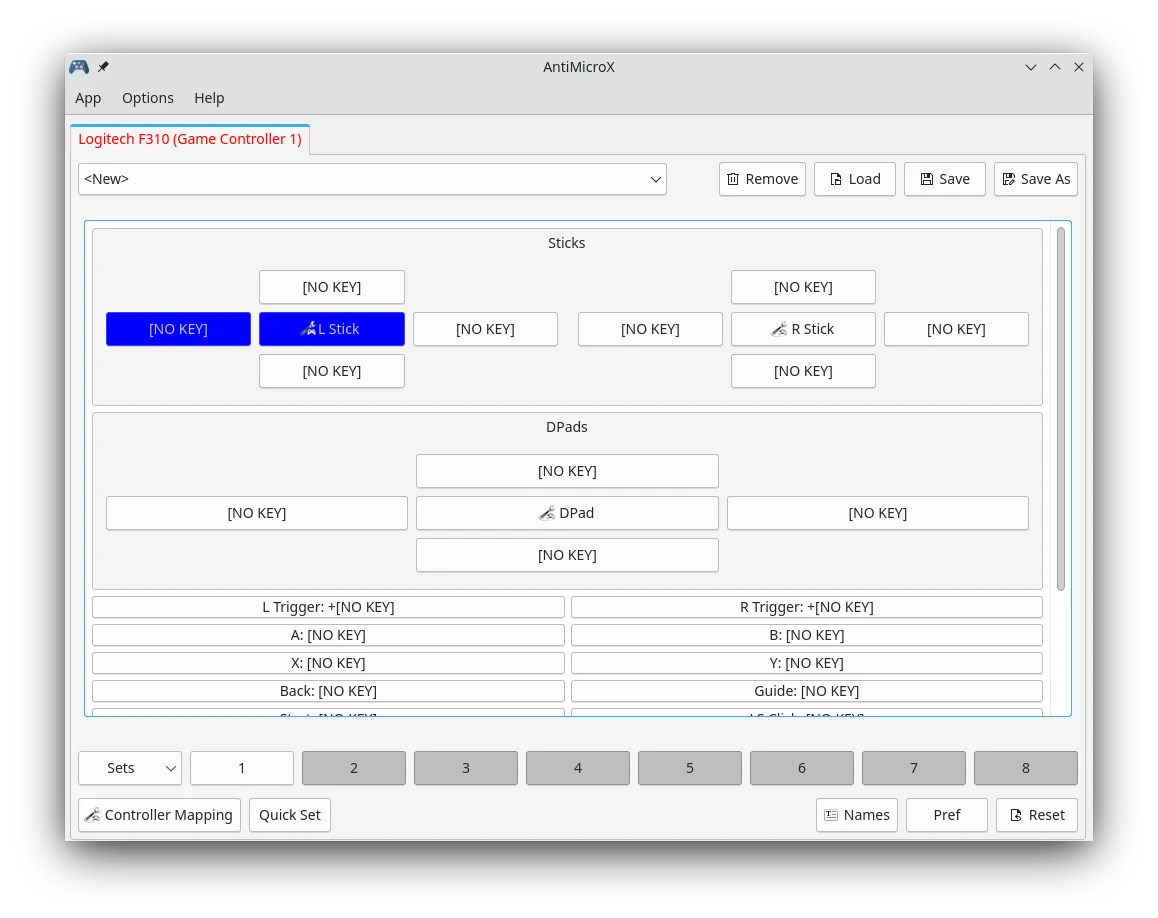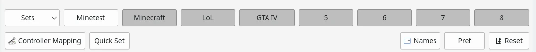 或者,你可以善用AntiMicroX最下面的一排「Set」,在單一個AntiMicroX設定檔裡加入多款遊戲的手把按鍵,這樣的話你只要按這裡就能切換不同的組合。