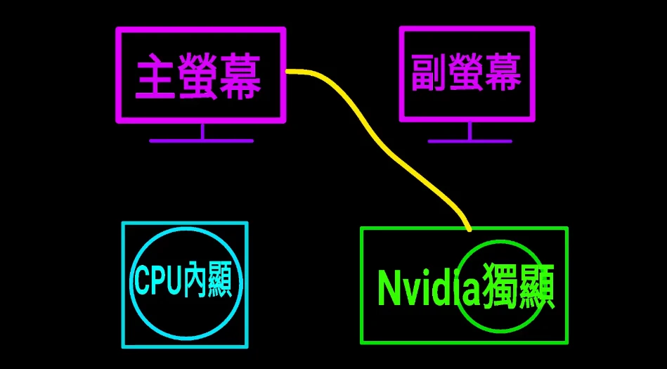 理論上遊戲效能在副螢幕(連接到Nvidia顯示卡)最好。像我這種不想接第二個螢幕的,就會將副螢幕換成「HDMI顯卡欺騙器」,約一個轉接頭大小而已,並在Windows顯示設定將螢幕只顯示於虛擬機視窗,就可以用單一螢幕同時操控Linux和Windows。