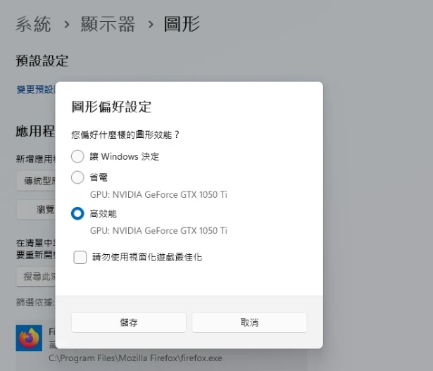 接著在系統設定 → 顯示器 → 圖形,指定應用程式使用Nvidia顯示卡彩現,而非QXL。