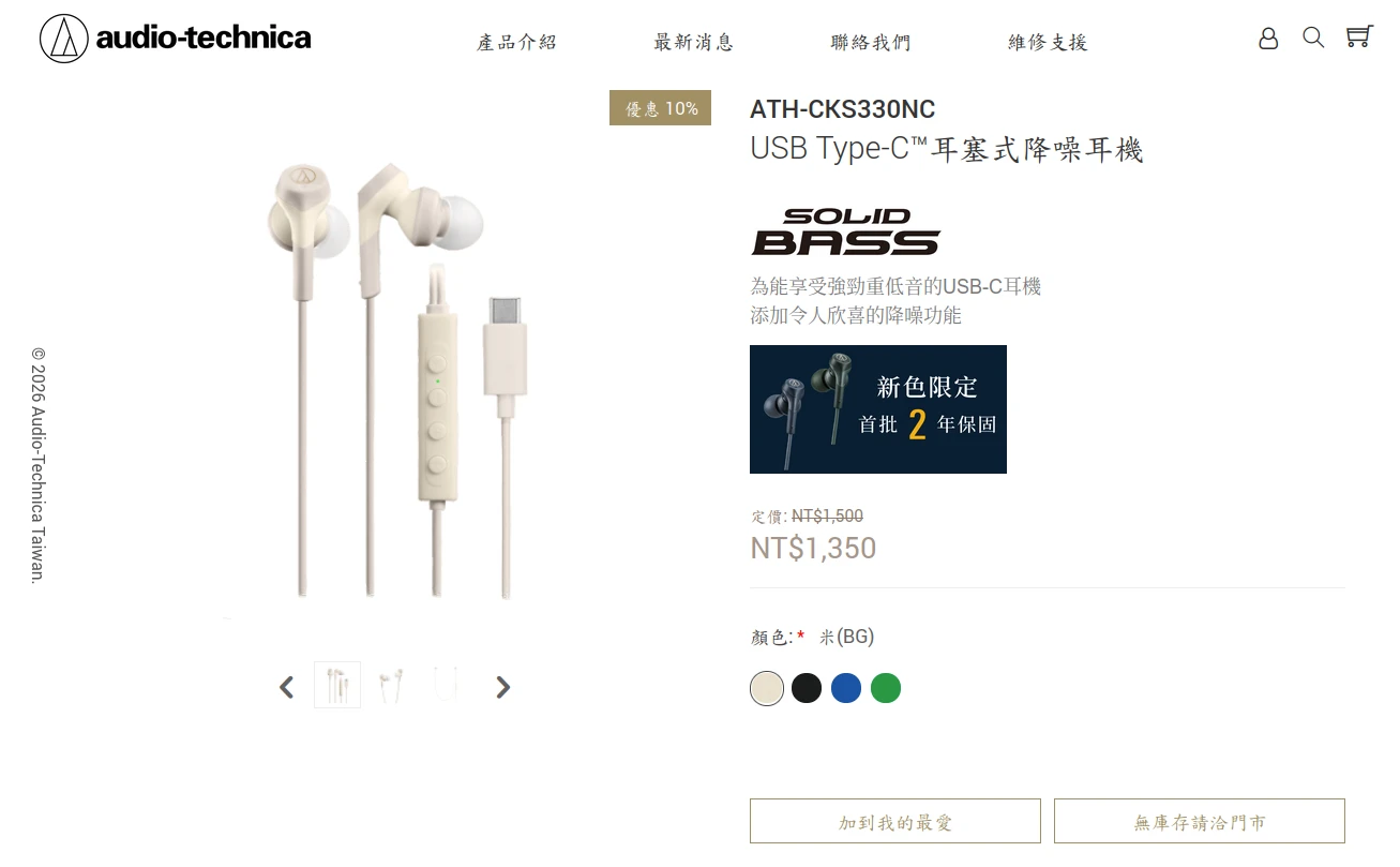 「ATH-CKS330NC」是2024年上市的耳塞式耳機,售價1,500元。