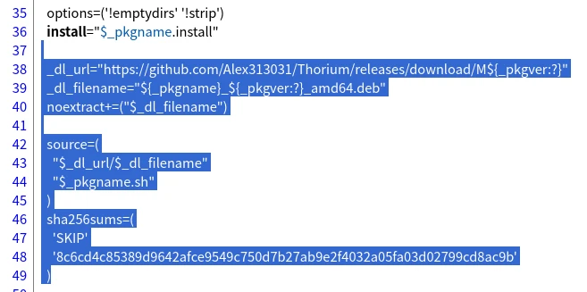 觀察PKGBUILD可以得知它是從Github下載程式二進位檔的,並且有sha256校驗碼