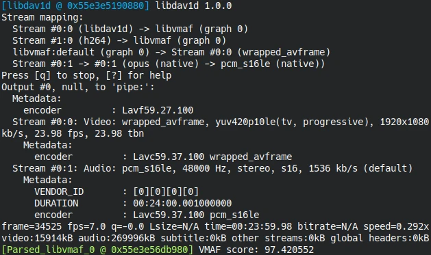 ffmpeg -i input_aom.mkv -i input.mkv -filter_complex libvmaf -f null -