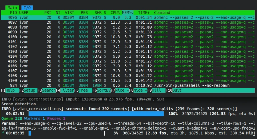 撰文當下測試的系統:Arch Linux 6.4.4,CPU Intel I5-7400,Av1an版本0.4.1。