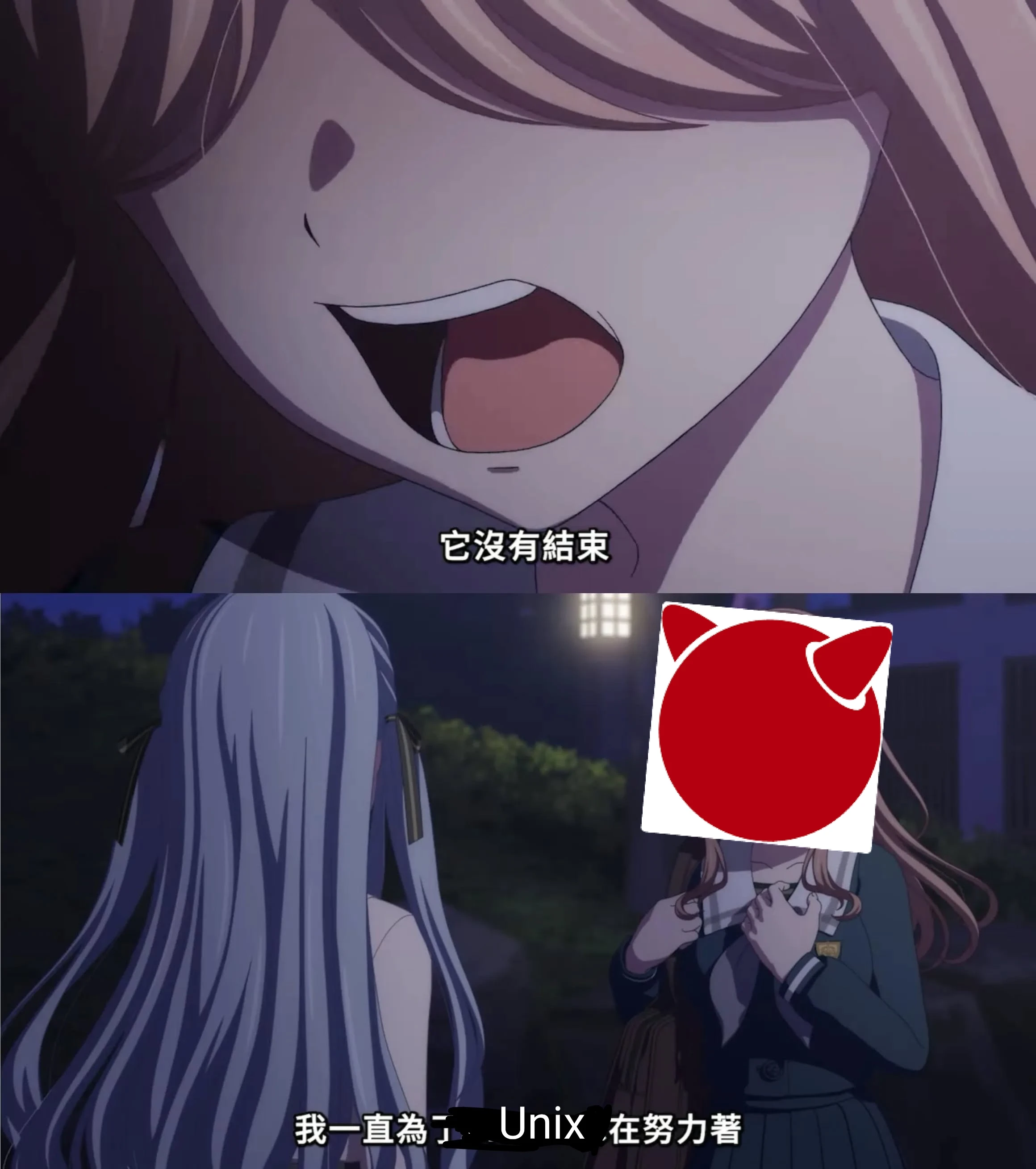 FreeBSD:為什麼?為什麼要說忘記這種話呢?我們,以前感情明明那麼好。Ken和Dennis每天都開心地寫C語言,大家在一起,現在卻分裂成System V和BSD各奔東西也太奇怪了吧。「Unix是屬於世界駭客的命運共同體」,這麼說的人不正是AT&T醬嗎?