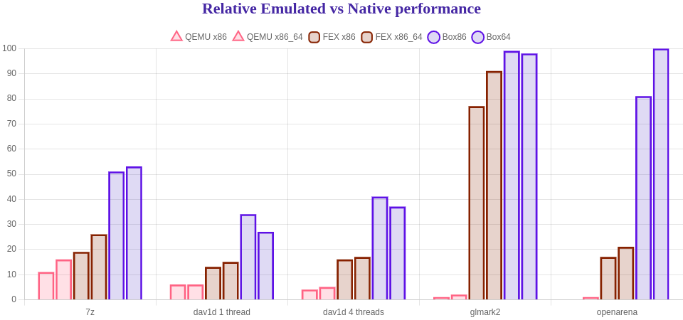 Box86/Box64在userspace執行,使用"Dynamic recompilation"提升轉譯效率。根據下圖開發者ptitSeb的跑分比較,Box86的效率比QEMU User和FEX-Emu的高很多,甚至可以比肩Apple的Rosetta2。