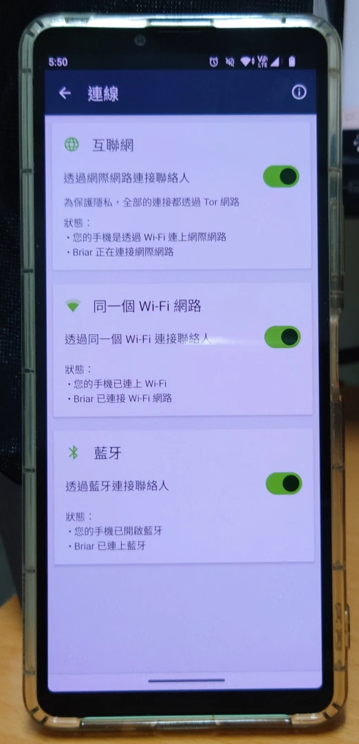 Briar主要提供三種連線方式,分為網路、Wifi Direct、藍牙,可以強制指定要用哪種連線。