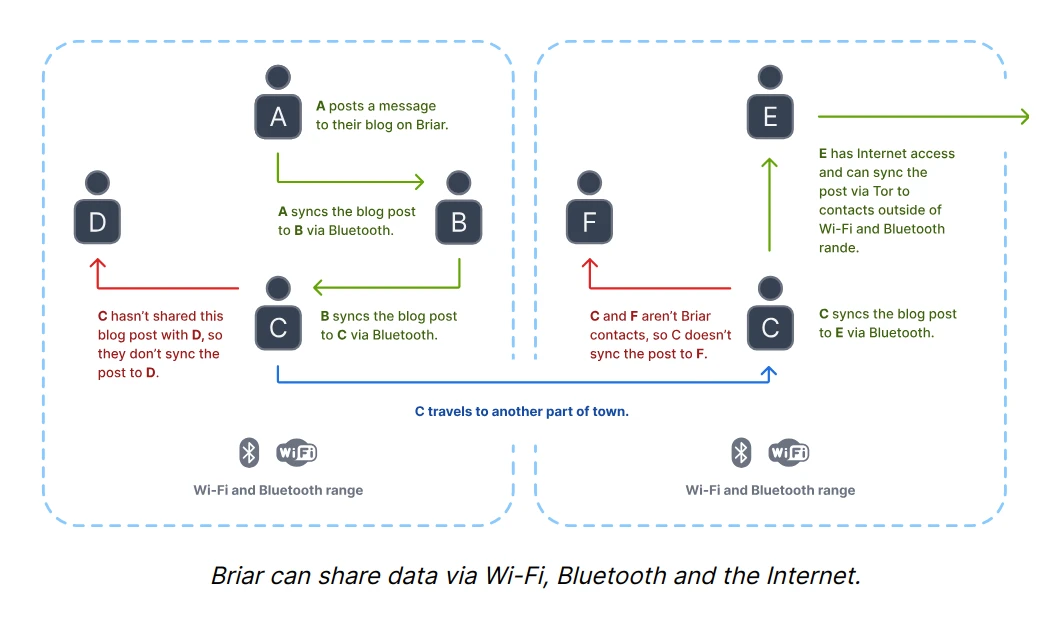 而Briar傳輸資料的時候可以不經過ISP電信商,而是直接依靠手機的藍牙通訊,並且對封包進行點對點加密,讓資訊完全不能被第三者攔截。即使藍牙通訊的訊號被偵測到了,攻擊者也無法讀取訊息內容。