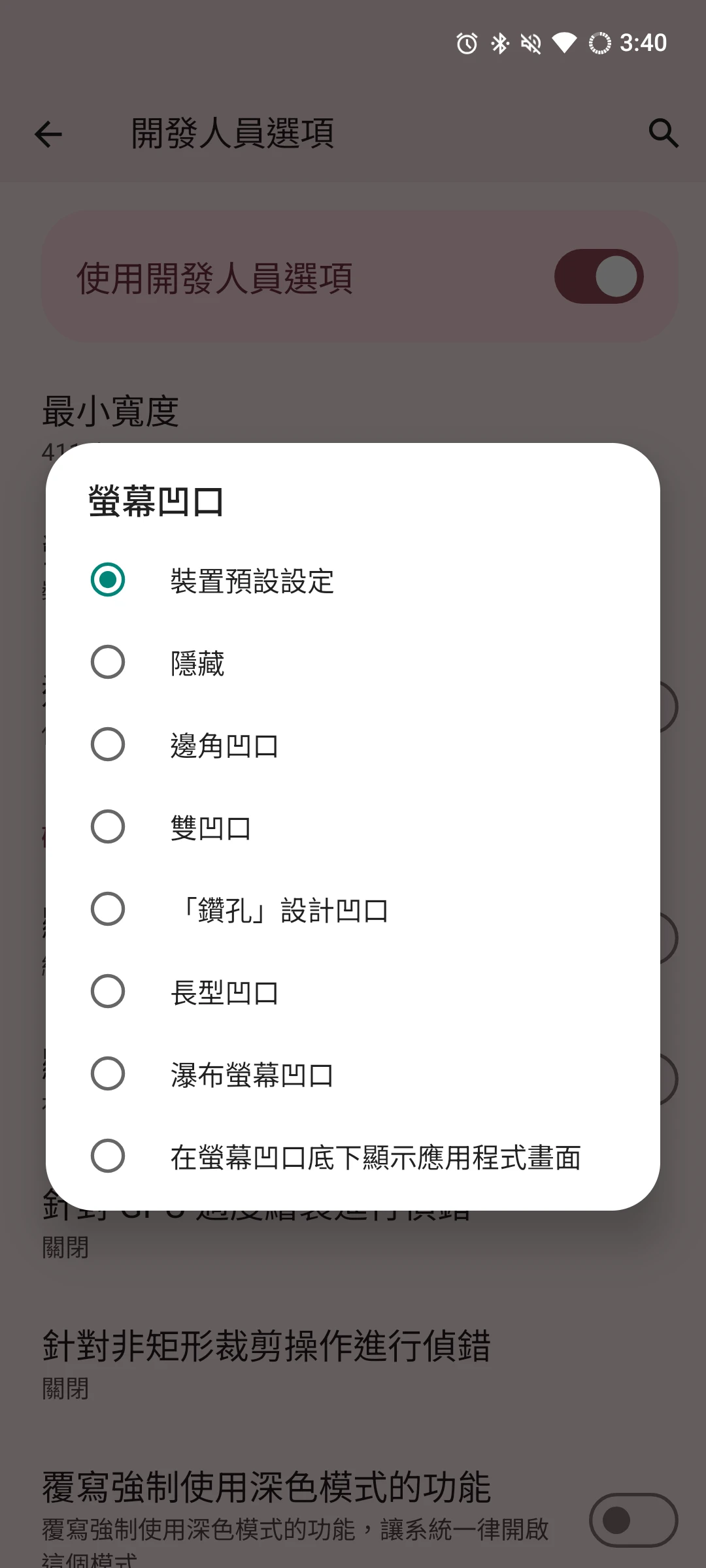 在開發人員選項 → 隱藏手機的挖孔或者瀏海,不然即使調整解析度它還是會顯示一個黑點。我覺得設定「在凹口下方顯示」圖示最好,手機上下的黑邊比例才會平衡一點。