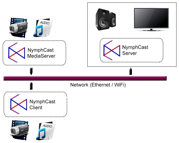 NymphCast為一套完整的解決方案,開放原始碼,目前已經能夠投放音樂和影片,尚提供媒體伺服器的功能。
