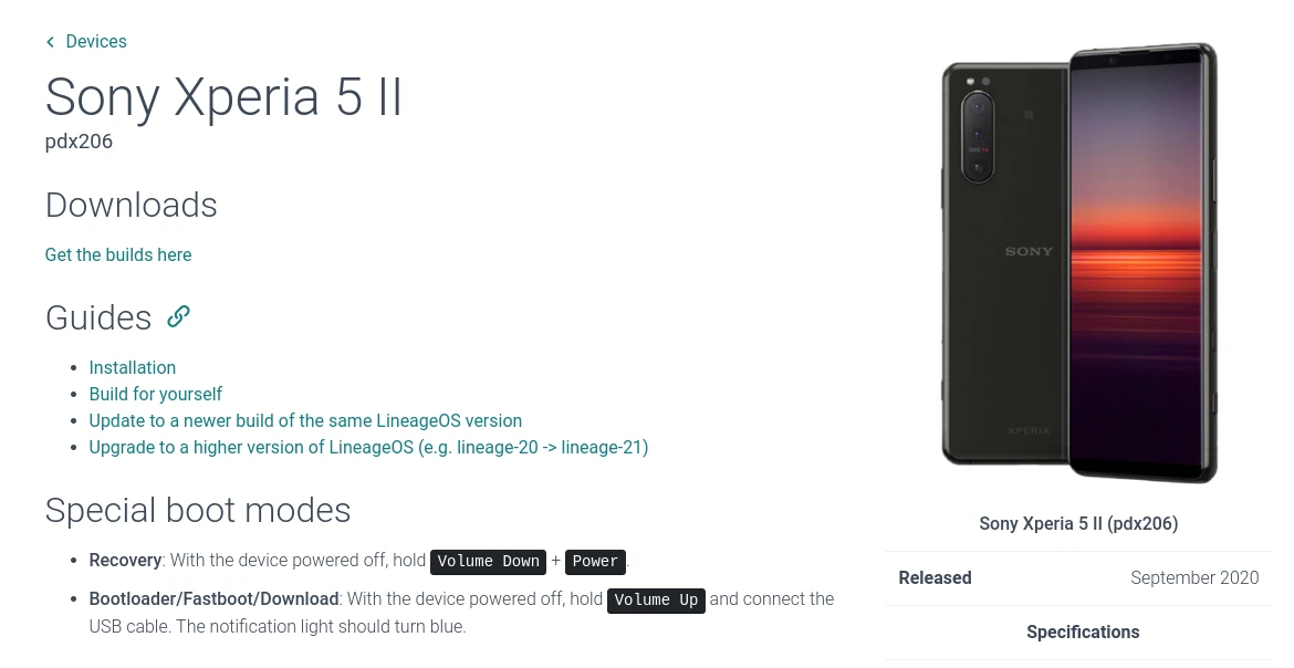 LineageOS Wiki,Sony Xperia 5 II (pdx206)的支援狀態現在是Official。凡是進入Official的裝置,LineageOS Wiki都會自動生成對應的編譯教學。