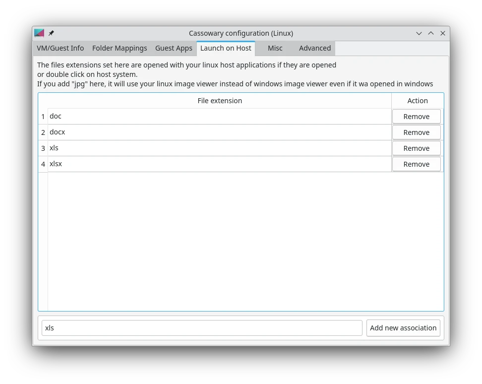 Cassowary的Launch On Host頁面可以設定不要用虛擬機應用程式開啟的副檔名,例如設定於Linux檔案管理員點二下.docx檔或.doc檔,改以Linux的LibreOffice開啟。