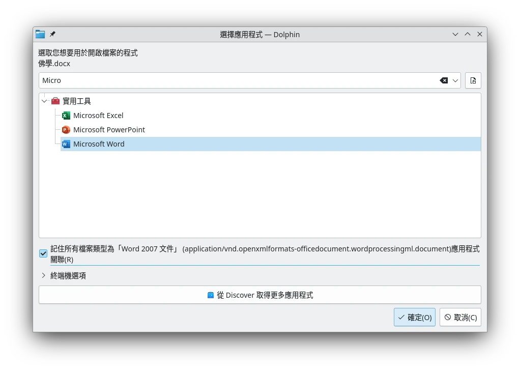 如果您使用的是KDE,您也可以對檔案按右鍵,把相關檔案格式與對應的Windows軟體相關聯。
