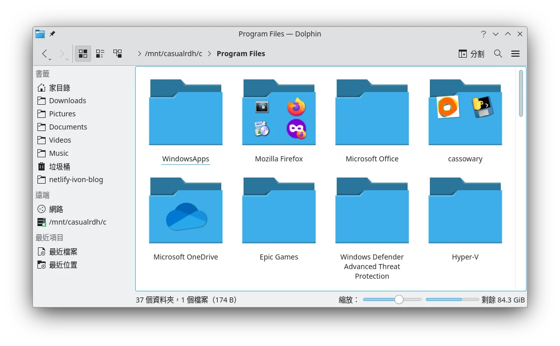 Windows → Linux是把Windows的C槽掛載至Linux上。點選Mount all,Linux即可用檔案管理員存取Windows磁碟檔案。