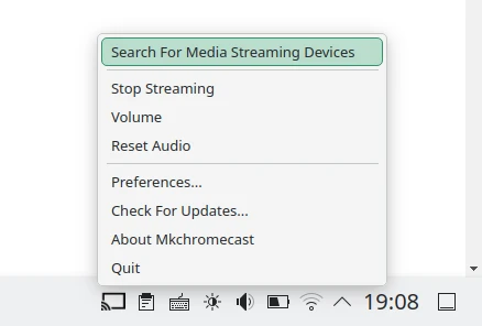 mkchromecast -t啟動,點選系統匣的按鈕掃描附近裝置
