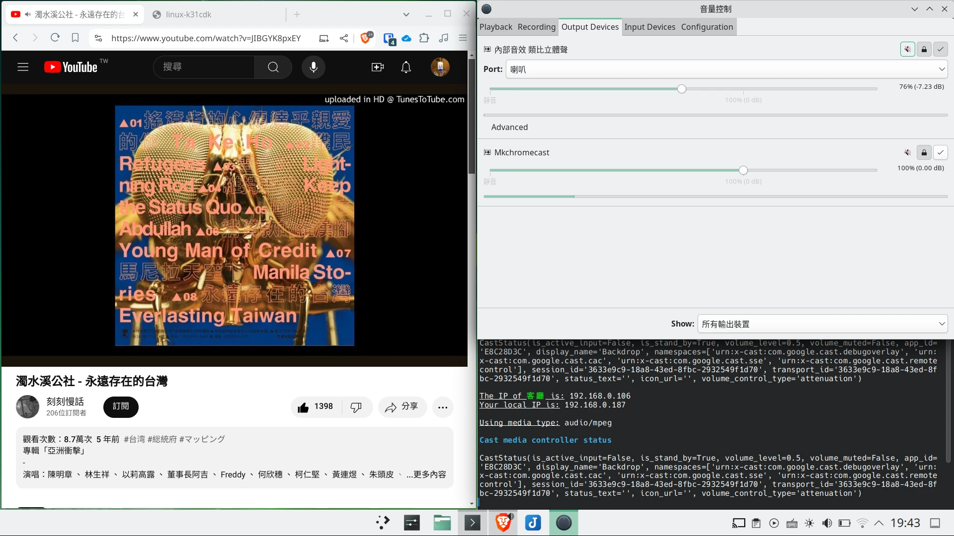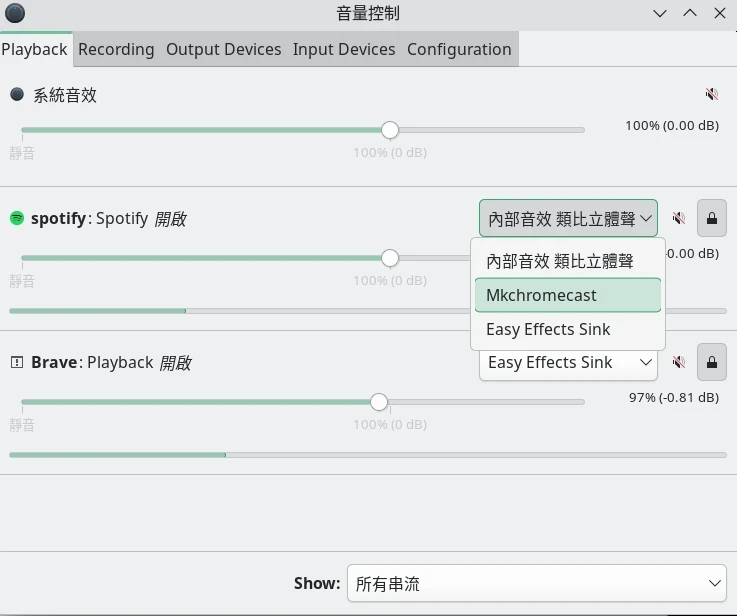 本功能跟上述投放音訊的差別在於,mkchromcast會製造一個PulseAudio的sink,讓你可以用pavucontrol切換音訊輸出源,從而靈活切換播放的音樂。