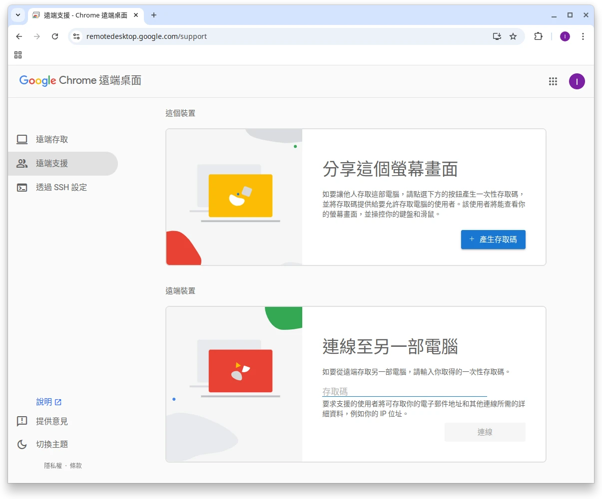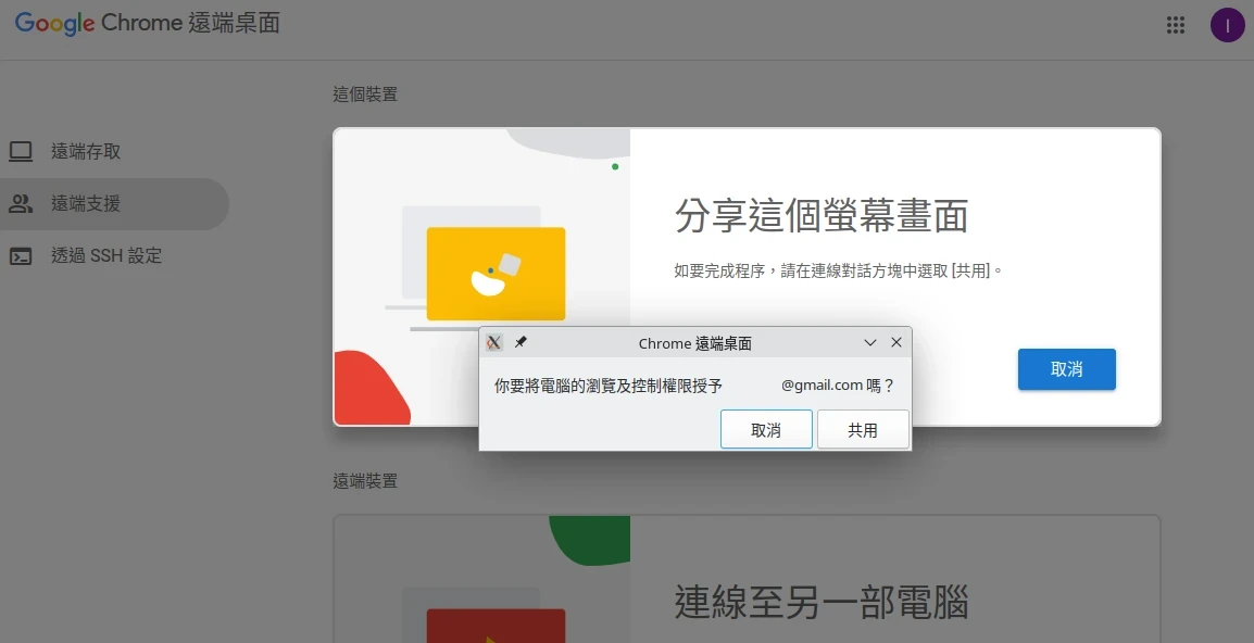 ~/桌面或~/Desktop。若你想要暫時讓不同Google帳號的用戶控制你的電腦,請到Chrome遠端桌面網頁,選「遠端支援」,按「分享這個螢幕畫面」,產生存取碼。