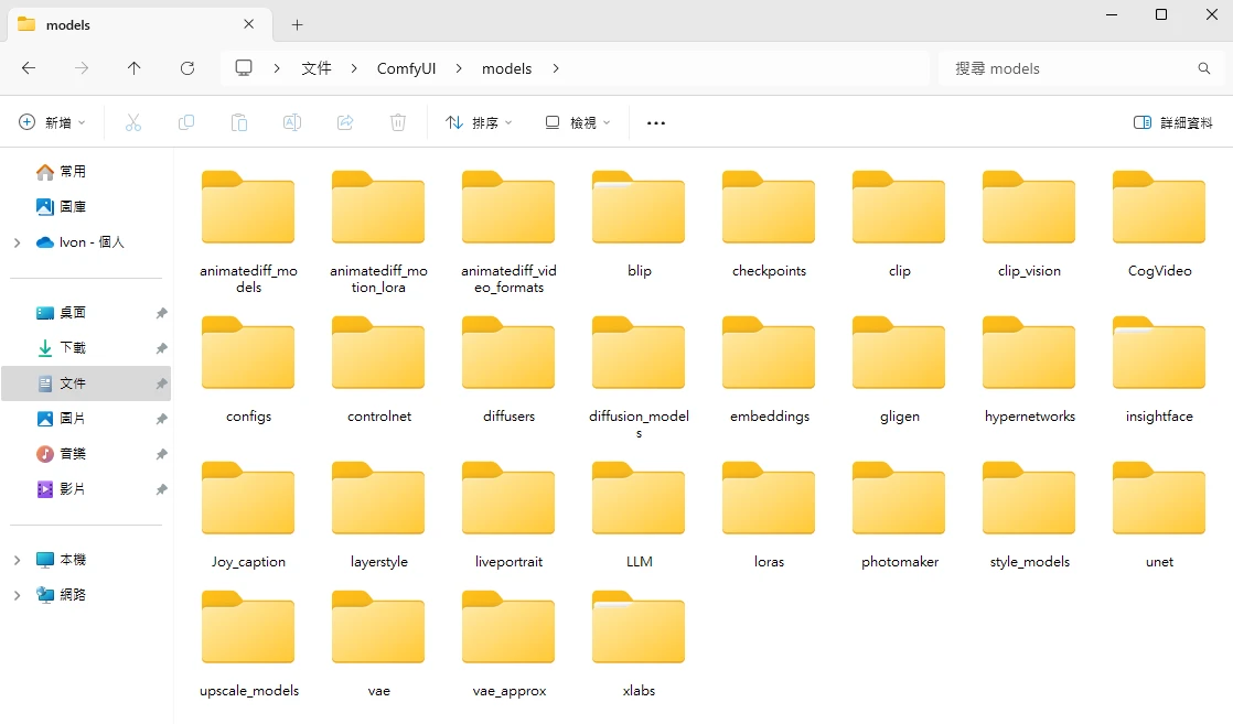ComfyUI Desktop的資料夾結構與ComfyUI類似,它會把模型和自訂節點的檔案放在安裝的時候所指定的路徑。例如,我們上面安裝ComfyUI Desktop的時候是指定C:\Users\使用者名稱\Documents\ComfyUI,那麼你要下載自訂生圖模型的時候,就是放到文件\ComfyUI\models資料夾。