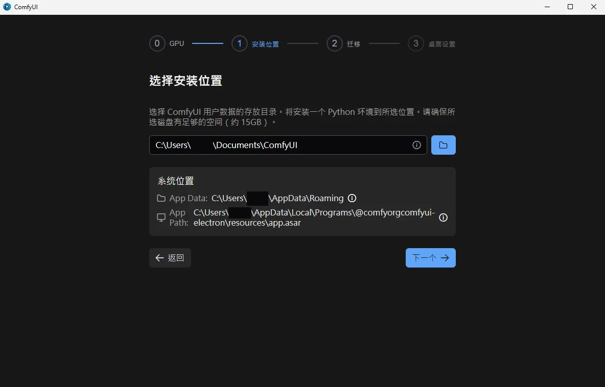 C:\Users\使用者名稱\Documents\ComfyUI。程式與模型資料至少需要20GB以上空間。
