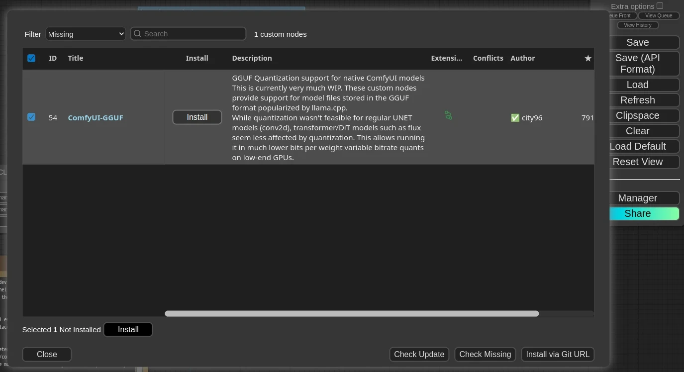 點一下左上角的Manager → Install Missing Custom Nodes,下載缺少的擴充功能,再按下Restart重新啟動ComfyUI。